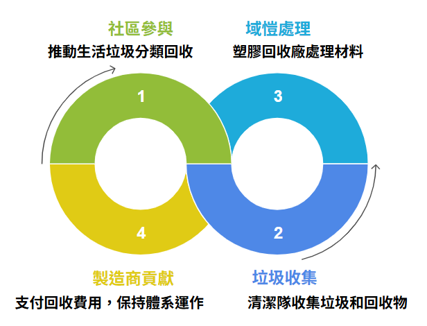 1997 年環境部推行資源回收政策,通過社區民眾將垃圾分類(一般垃圾,資源回收物,廚餘),各地清潔隊負責收集民眾分類好的垃圾和可回收物,回收業者進行整理後,送至處理業者進行加工再利用,製造商需繳納回收處理費維持整體運營。這種模式提高了回收效率,助於推動台灣的綠色經濟發展。